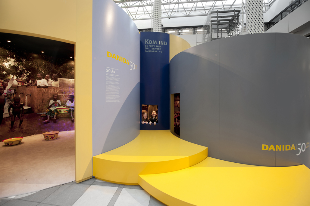 The form of the exhibition is based on elements of Danida’s corporate identity. Spatial elements in the form of circles of varying heights are used to create spaces that have an organic and inviting shape when viewed from the outside while creating an internal labyrinth of sensory rooms.