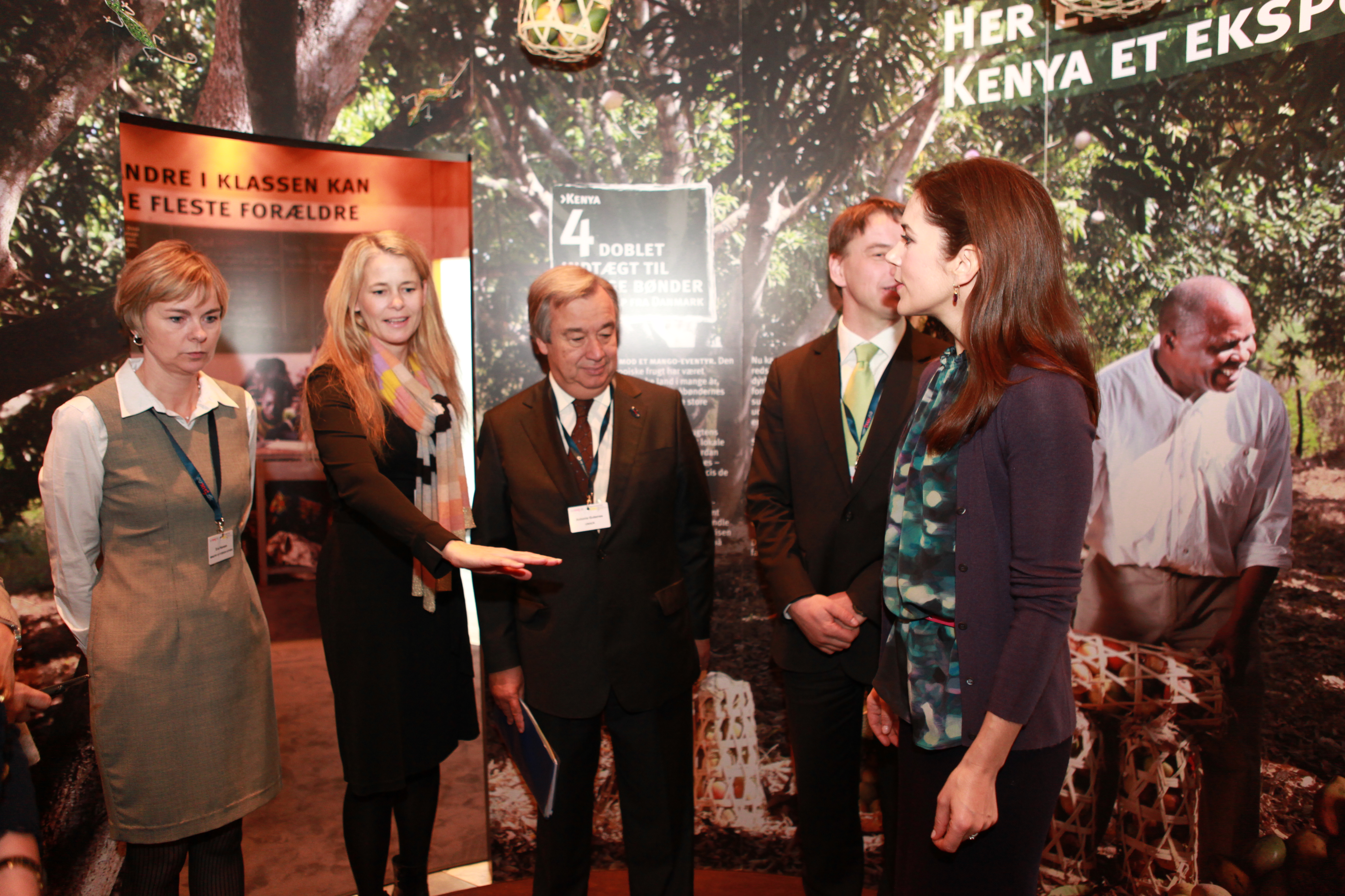 From the opening in Bella Center, experiencing the mango plantation room. From left: Ms. Eva Egesborg Hansen, Ms. Maiken Lyster Thonke, Mr. António Guterres, Mr. Christian Friis Bach, and HRH Crown Princess Mary.