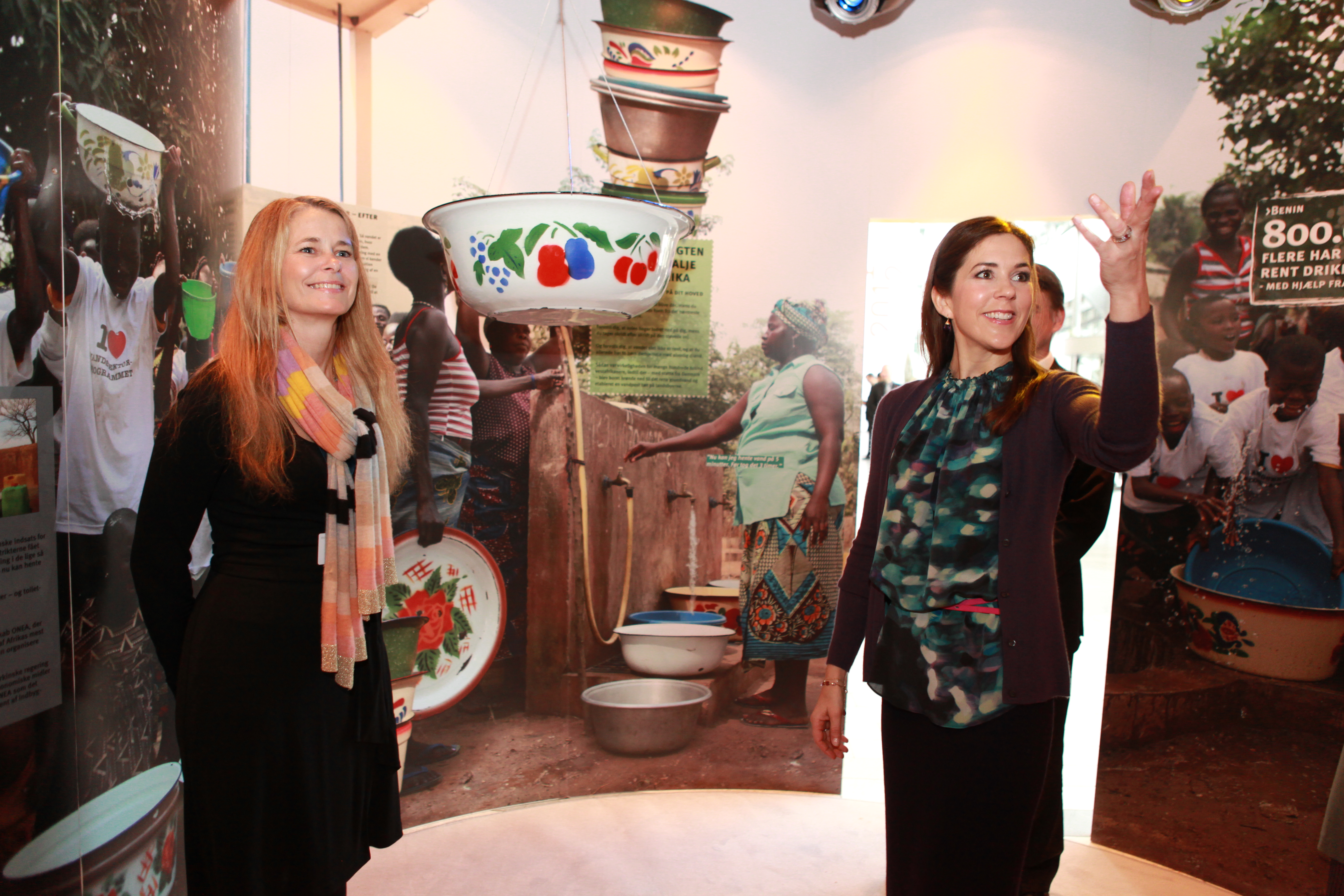 Left: The view of the exhibition from 2nd floor in Lyngby Storcenter. Right: From the opening in Bella Center, HRH Crown Princess Mary gives her speech on the podium, Mr. Christian Friis Bach, Minister for Development Cooperation stands to the right.